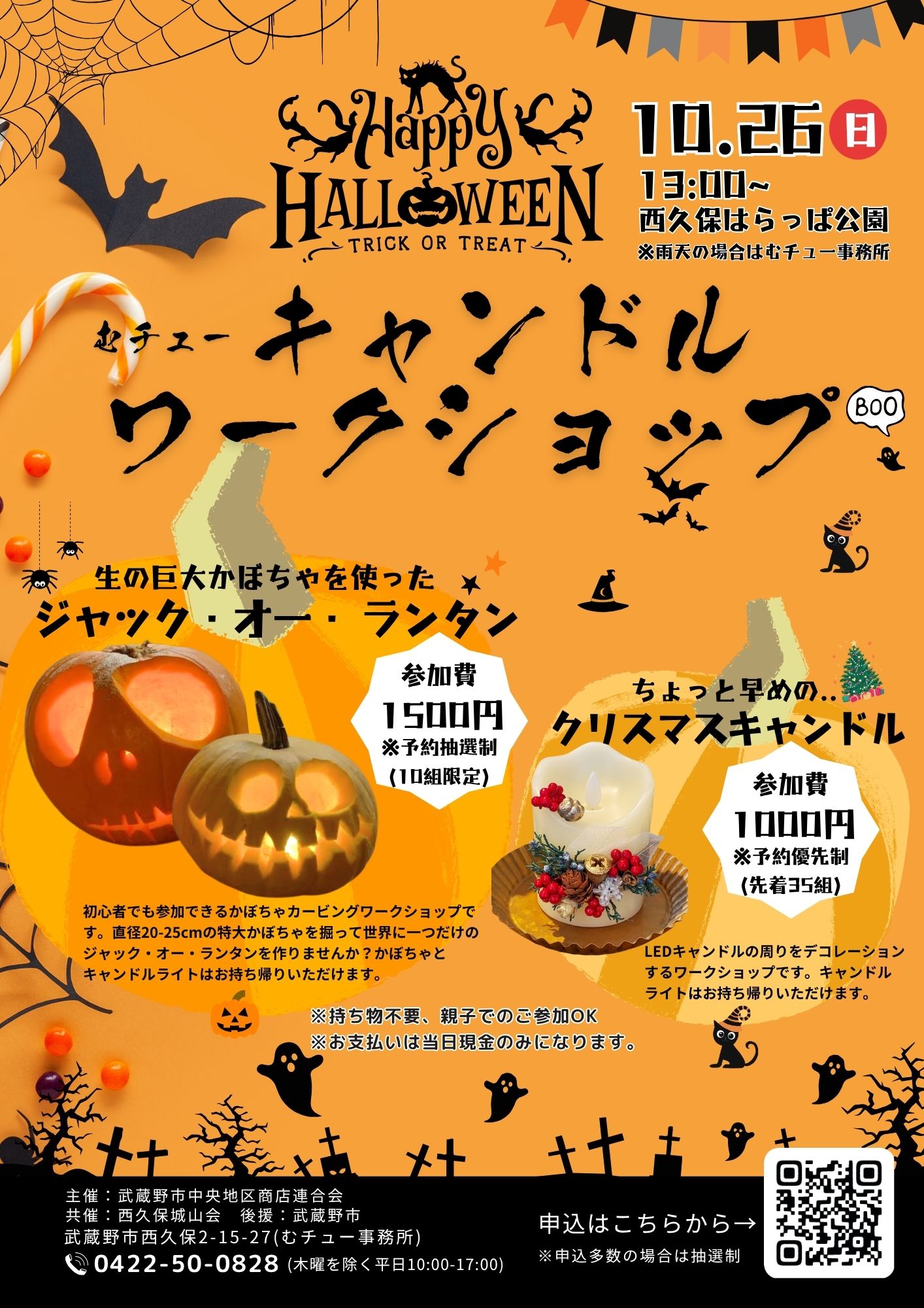 武蔵野市中央地区商店連合会では、11/26(日)むチューキャンドルワークショップを開催。生の巨大かぼちゃを使ったジャック・オー・ランタンづくり、クリスマスキャンドルづくりのワークショップを予約制で開催します!皆さまのお申込みをお待ちしております!詳しくはチラシをご覧ください。